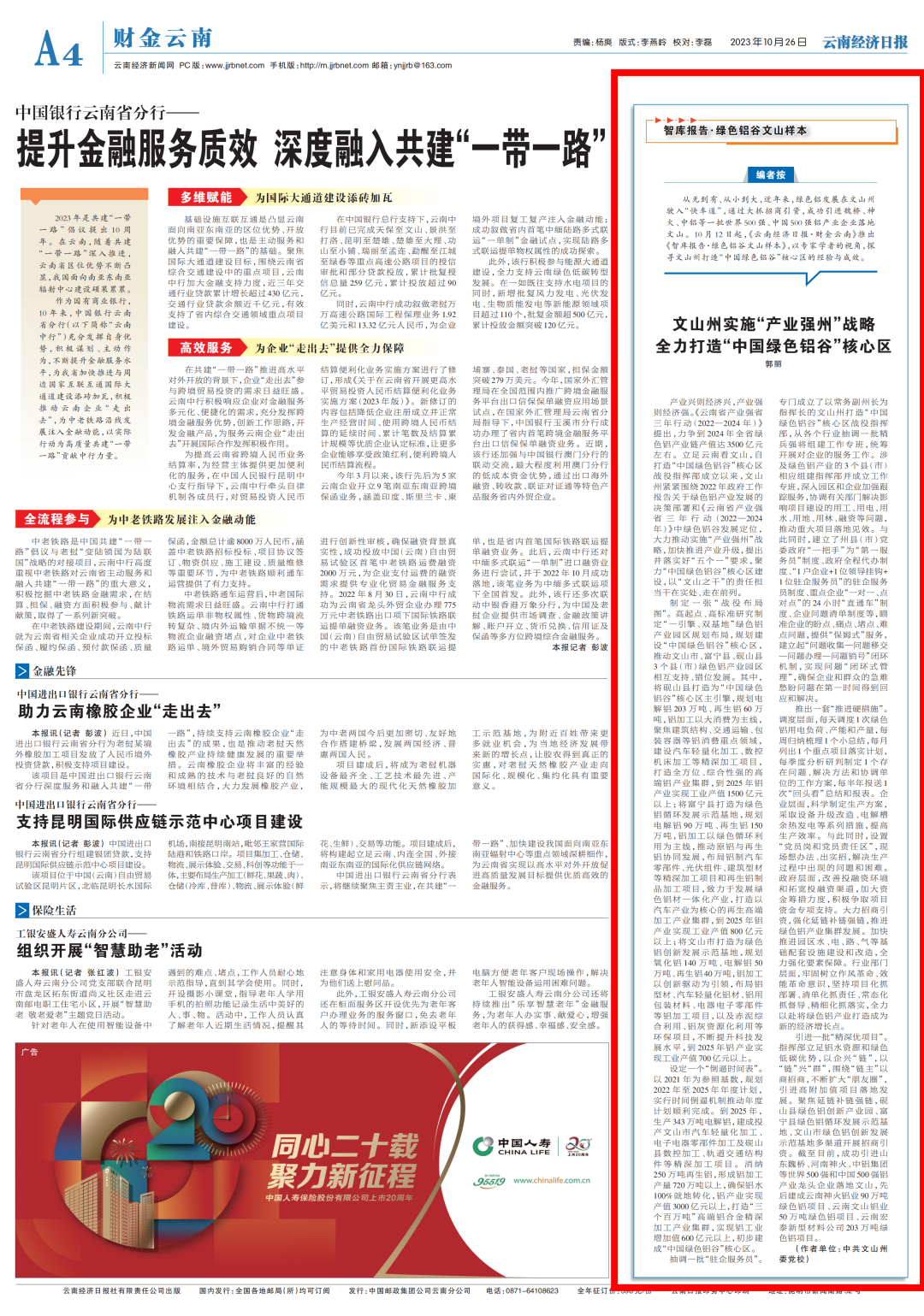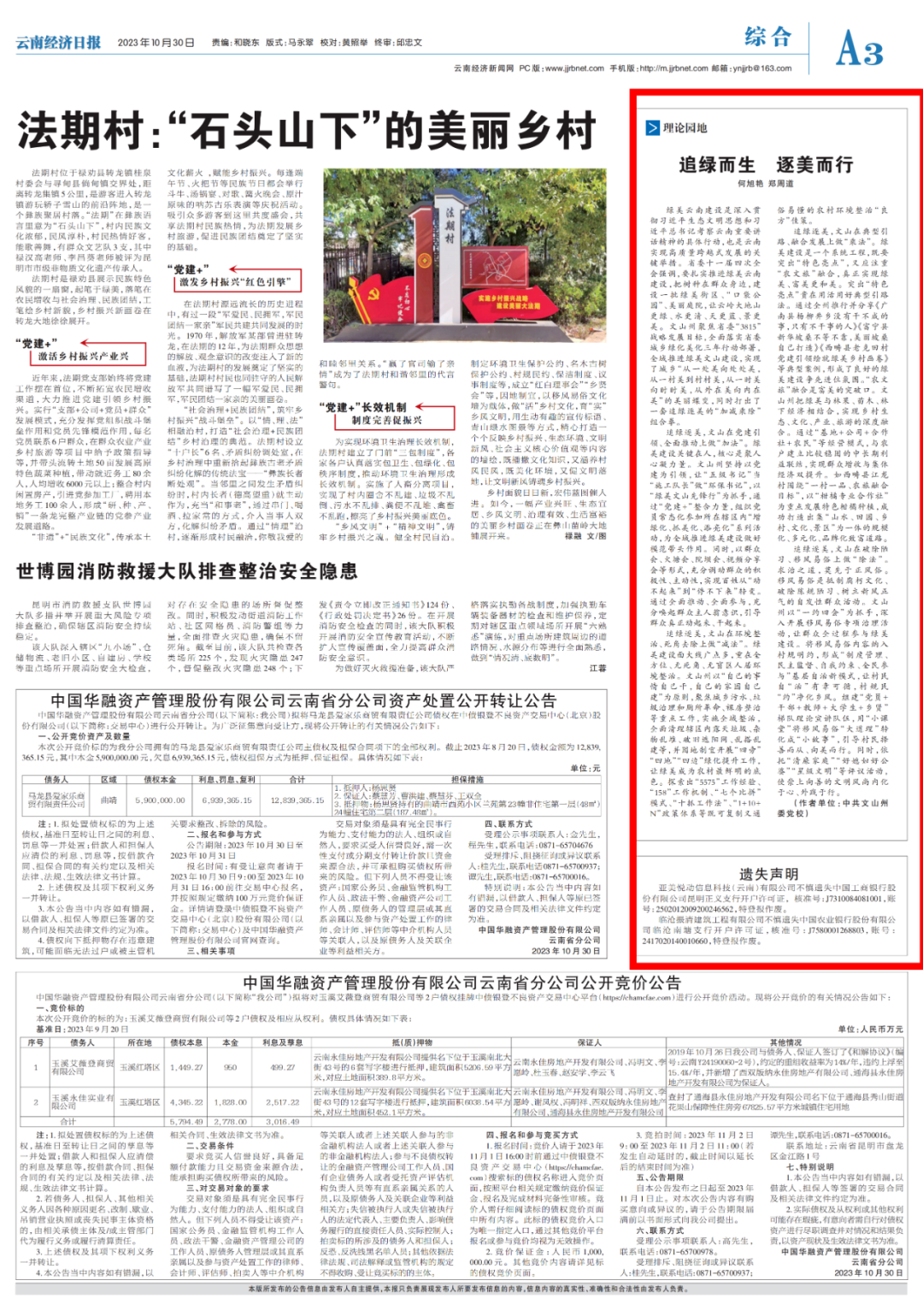 近日,云南老山干部学院、文山州委党校三位教师的文章荣登《云南经济日报》,分别是党史党建教研室副主任、讲师何旭艳和主任、副教授郑周道的文章《追绿而生 逐美而行》;经济学教研室讲师郭丽的文章《文山州实施“产业强州”战略 全力打造“中国绿色铝谷”核心区》。