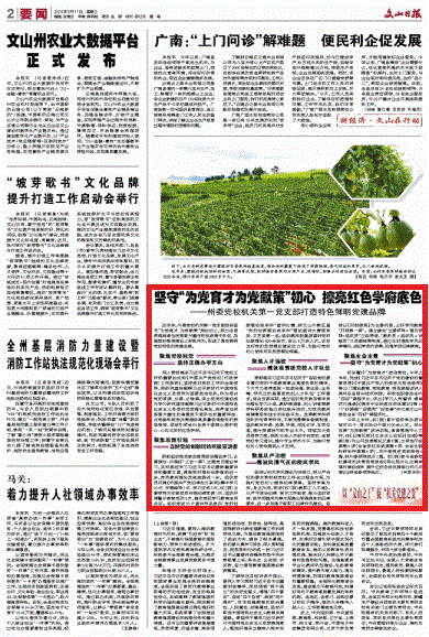 9月11日,《文山日报》刊发文章:《坚守“为党育才 为党献策”初心 擦亮红色学府底色——州委党校机关第一党支部打造特色鲜明党建品牌》。文章通过五个“聚焦”,详细阐释了文山州委党校机关第一党支部打造鲜明党校特色党建品牌做出的努力和取得的成效。