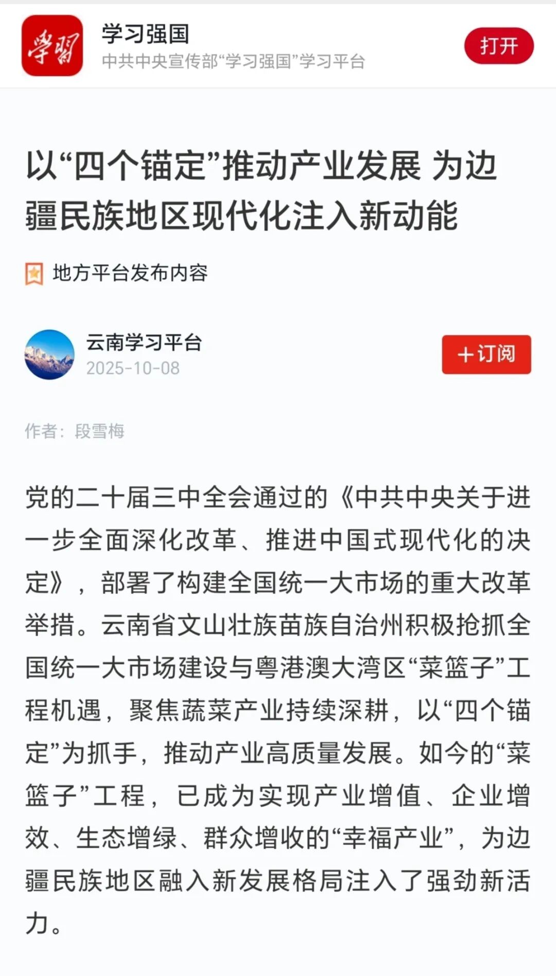 党的二十届三中全会通过的《中共中央关于进一步全面深化改革、推进中国式现代化的决定》,部署了构建全国统一大市场的重大改革举措。云南省文山壮族苗族自治州积极抢抓全国统一大市场建设与粤港澳大湾区“菜篮子”工程机遇,聚焦蔬菜产业持续深耕,以“四个锚定”为抓手,推动产业高质量发展。如今的“菜篮子”工程,已成为实现产业增值、企业增效、生态增绿、群众增收的“幸福产业”,为边疆民族地区融入新发展格局注入了强劲新活力。